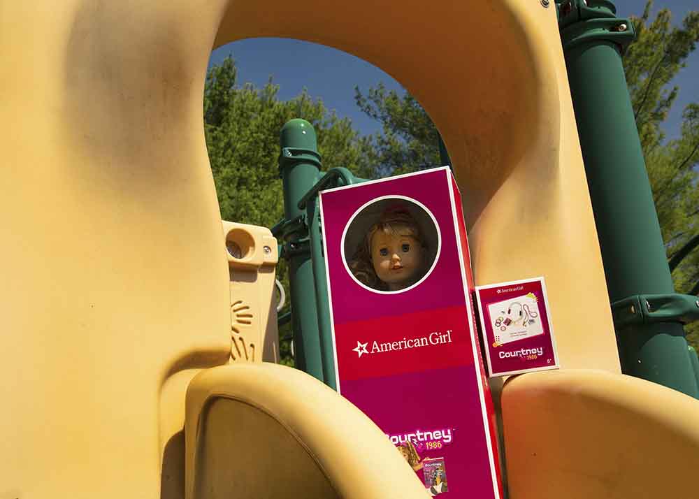 - An 18" Courtney™ doll with blue eyes that open and close, and curly sandy-blond hair with side-swept bangs